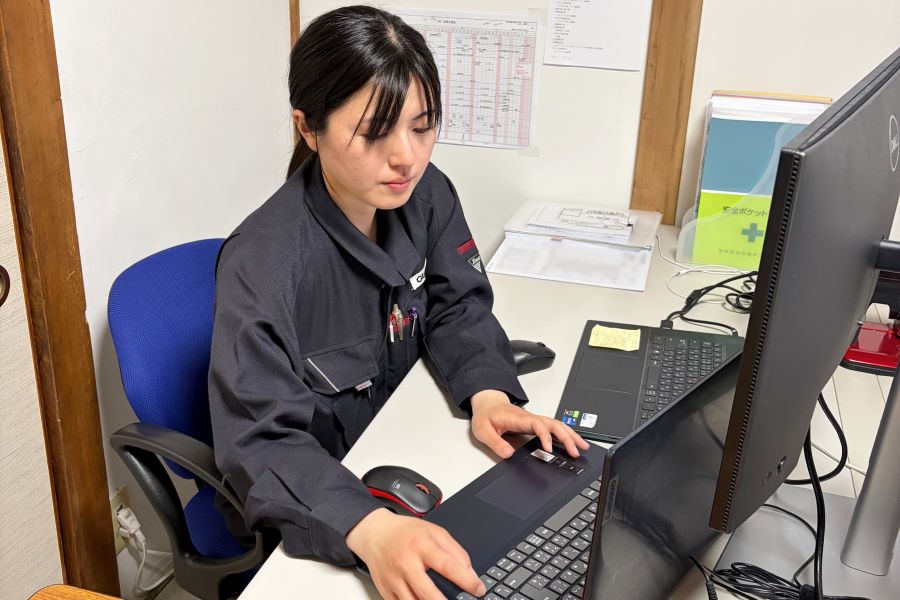 Yさん:所長にくっついていきながら勉強している状況で、朝礼や安全書類の作成、現場や検査に立ち会ったり、生コンの数量を調整したり…あとは搬出関係ですね。かぶらないように調整や打ち合わせもしています。まだ図面を書いたり細かい納まりの打ち合わせをしたりという事までは出来ていないので、これから学んでいきたいなと思っています。